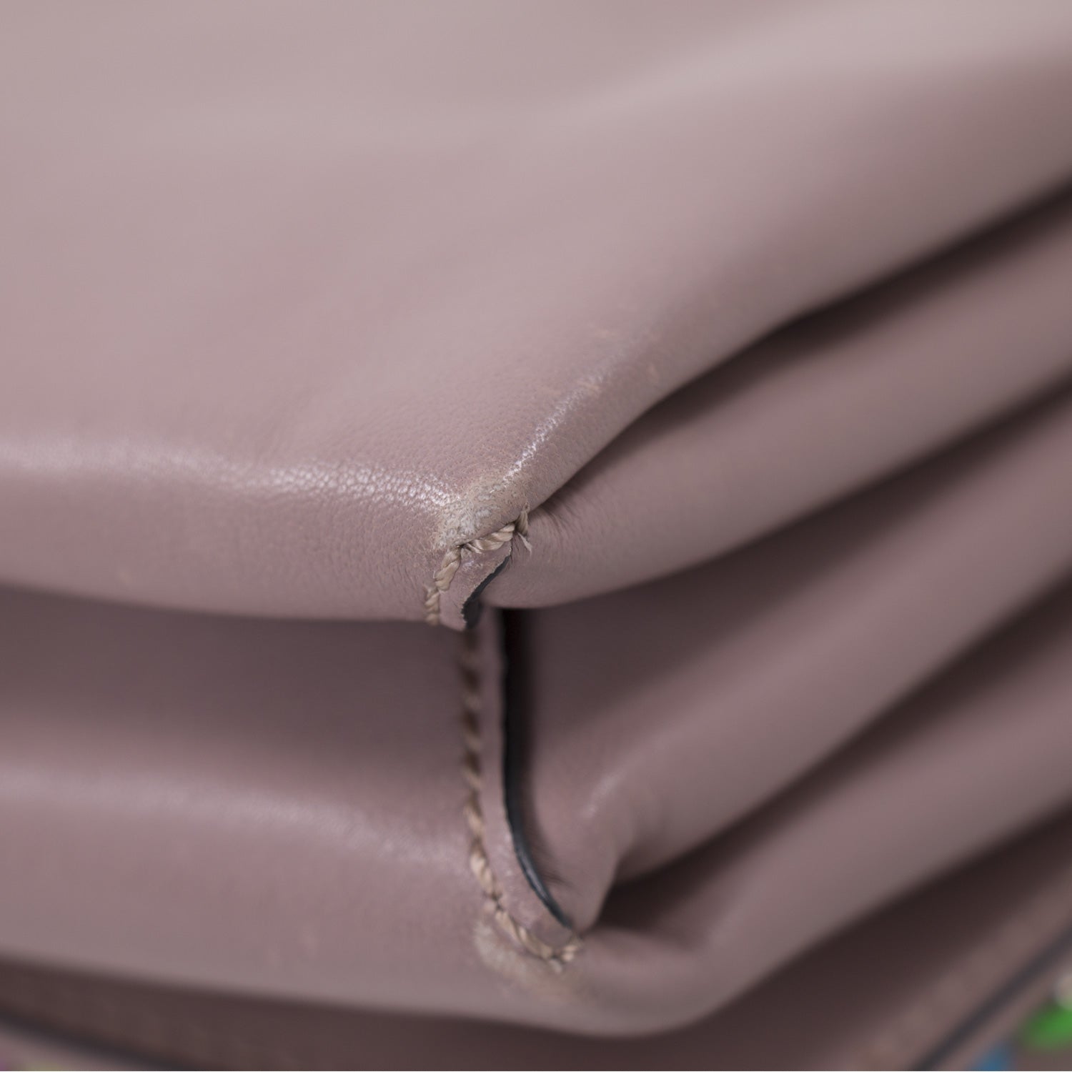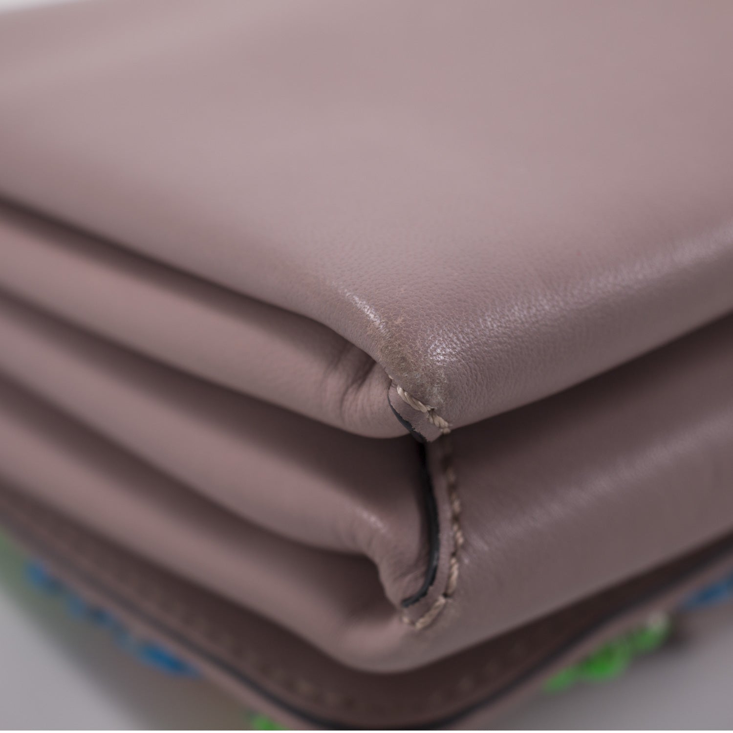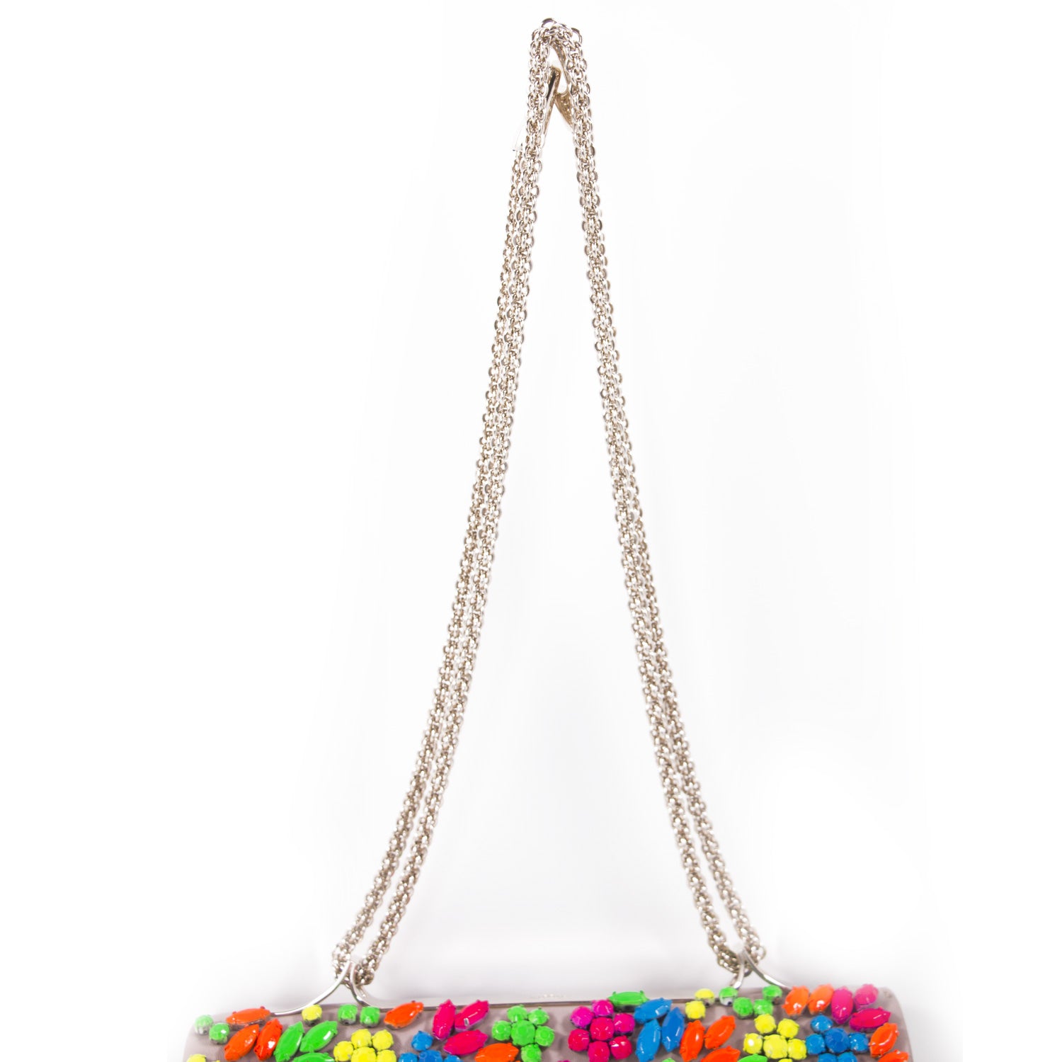 Details: Taupe (Poudre) Leather / Gold-Tone Hardware / Multicolor Bead Embellishments at Front Face / Detachable and Convertible Shoulder Strap / Hand Strap at Front Face Featuring Rockstud Accents / Black Leather Trim / Dual Compartment at Inside with a Flat Pocket / Magnetic Snap Closure at Front Face