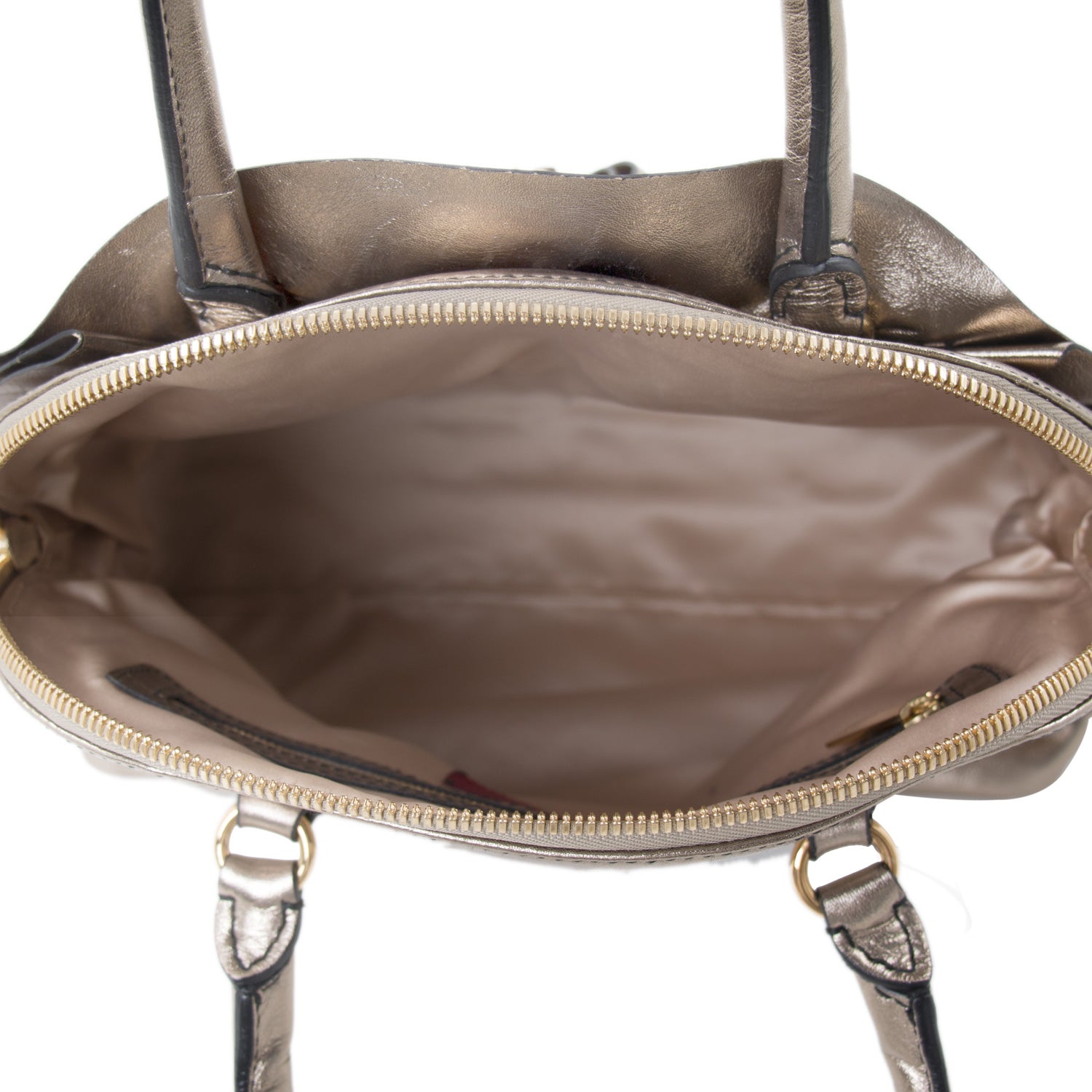 Details: Metallic Bronze Leather / Gold-Tone Hardware / Dual Rolled Handles / Detachable Shoulder Strap / Flower Embellishment at Front Face / Designer Logo at Side / Champagne Satin Lining at Interior / Zipper Pocket at Inside / Dual Zip Closure at Top