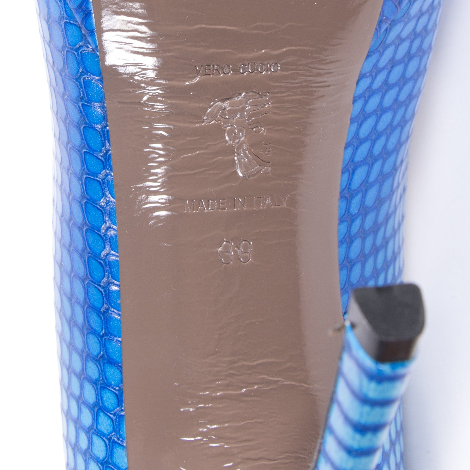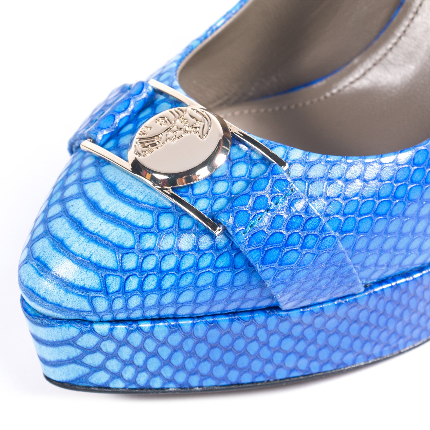 Details: Light Blue Snake Skin / Leather Lining / Gold Tone Hardware / Covered Heel And Platform / Tonal Stitching / Logo Metal Embellishment At Front