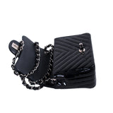 Details: Black Patent Chevron Leather / Silver-Tone Hardware / Chain-Link and Leather Shoulder Strap / Leather Interior Lining / Zipper and Flat Pocket at Inside / Flap Closure with Turn-Lock