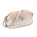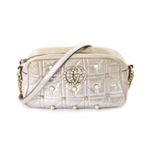Details: Silver Metallic Leather/ Antique Gold Hardware / Pearls and Studs Embellishments at Front and Back / Long Chain and Leather Shoulder Strap / Pink Satin Lining at Interior / SIngle Flat Pocket