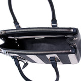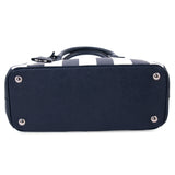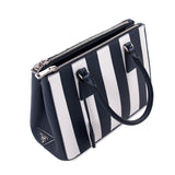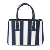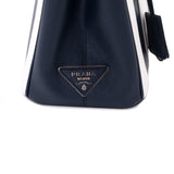 Details: Blue and White Saffiano Leather / Silver-Tone Hardware / Dual Rolled Handles / Detachable Adjustable Shoulder Strap / Navy Blue Interior Lining / Three Compartments, Two with Zipper Closure / Flat and Zipper Closure at Inside