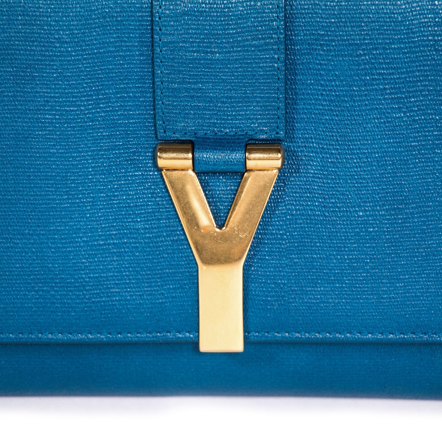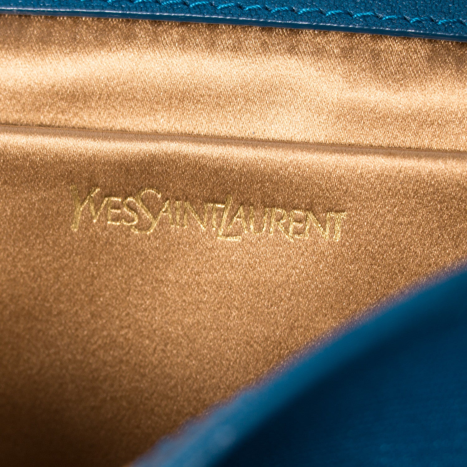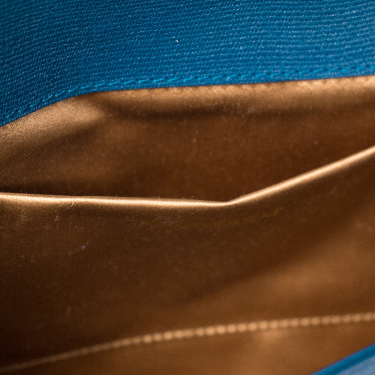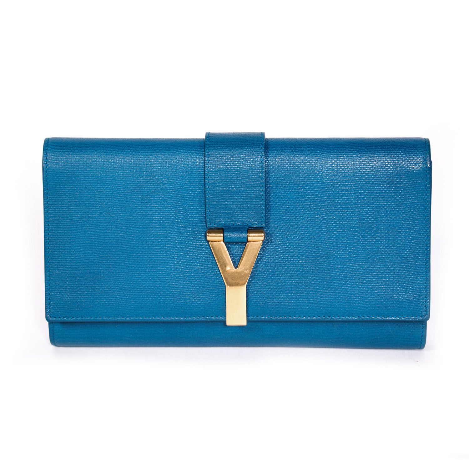 Details: Ink Blue Textured Leather / Gold Tone Hardware / Designer Logo At Front / Champagne Satin Interior Lining / Single Compartment / Single Flat Pocket At Interior Wall / Magnetic Snap Closure At Front Flap