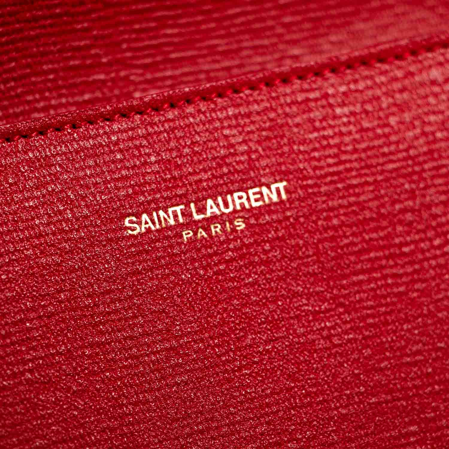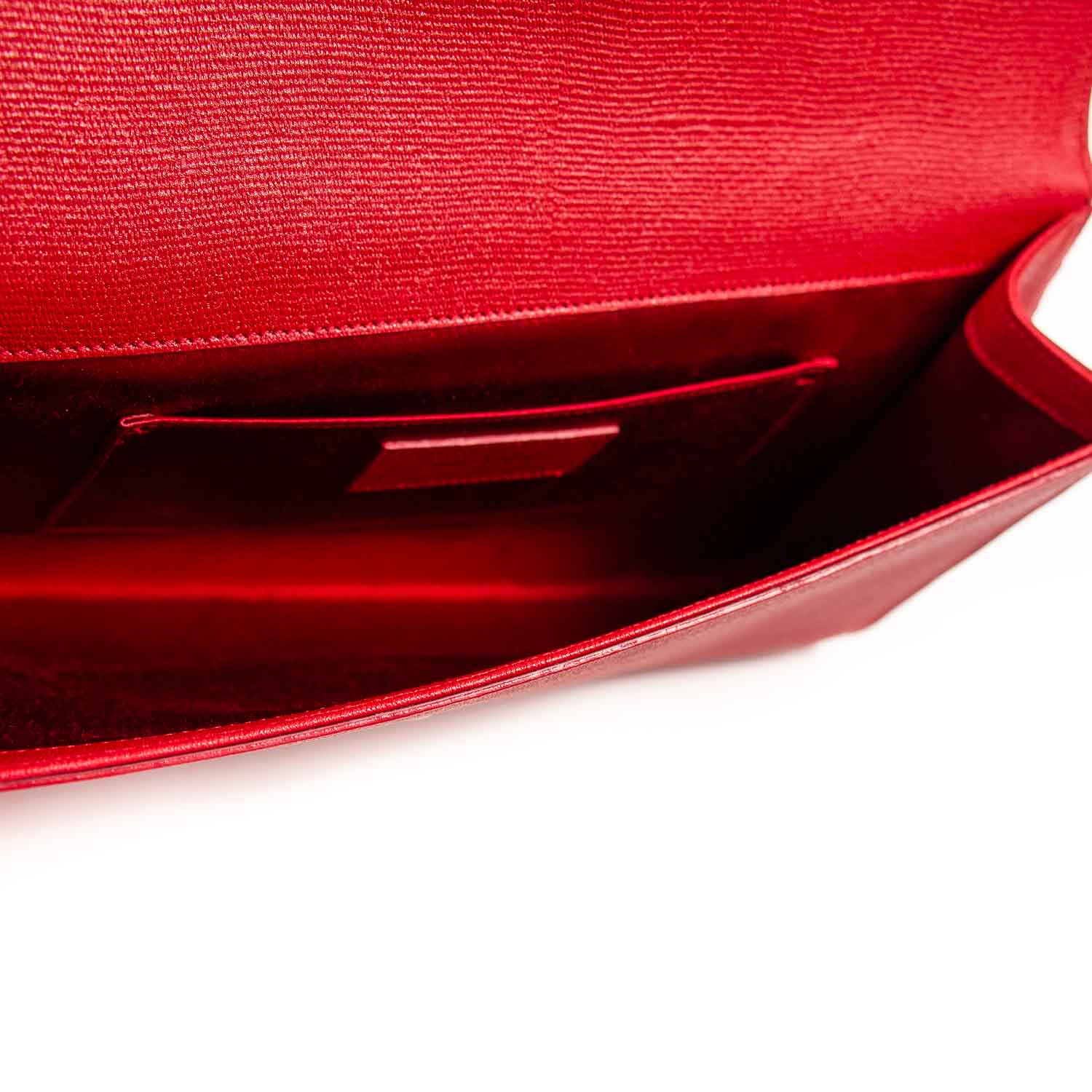Details: Red Textured Leather / Gold Tone Hardware / Designer Logo At Front / Red Satin Interior Lining / Single Compartment / Single Flat Pocket / Magnetic Snap Closure at Front Flap