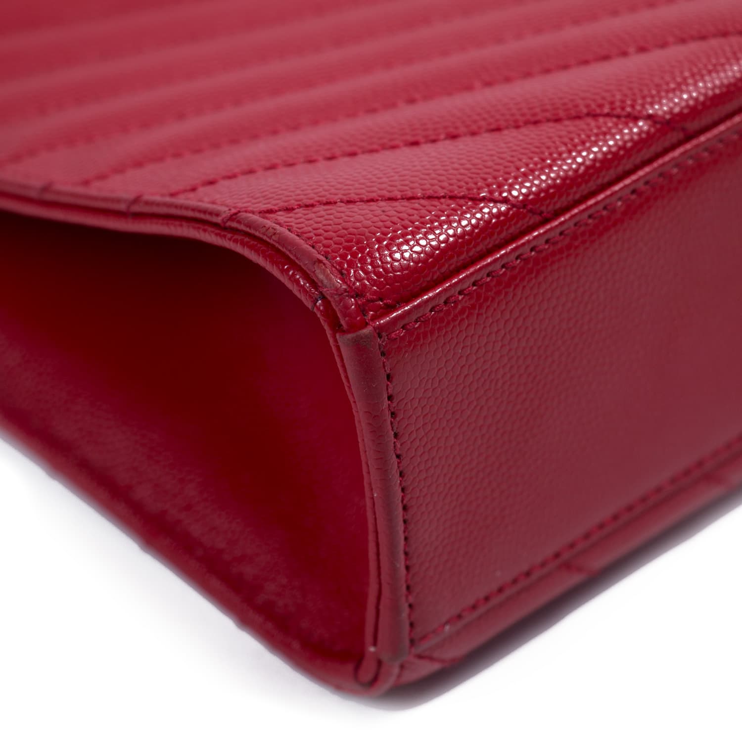 Details: Red Grain de Poudre Embossed Leather / Gold-Tone Hardware / Logo at Front Face / Dual Adjustable Chain-Link Leather Shoulder Strap / Exterior Pocket at Back / Fabric Interior Lining / Single Compartment / Zipper Pocket at Inside / Magnetic Snap Closure at Front
