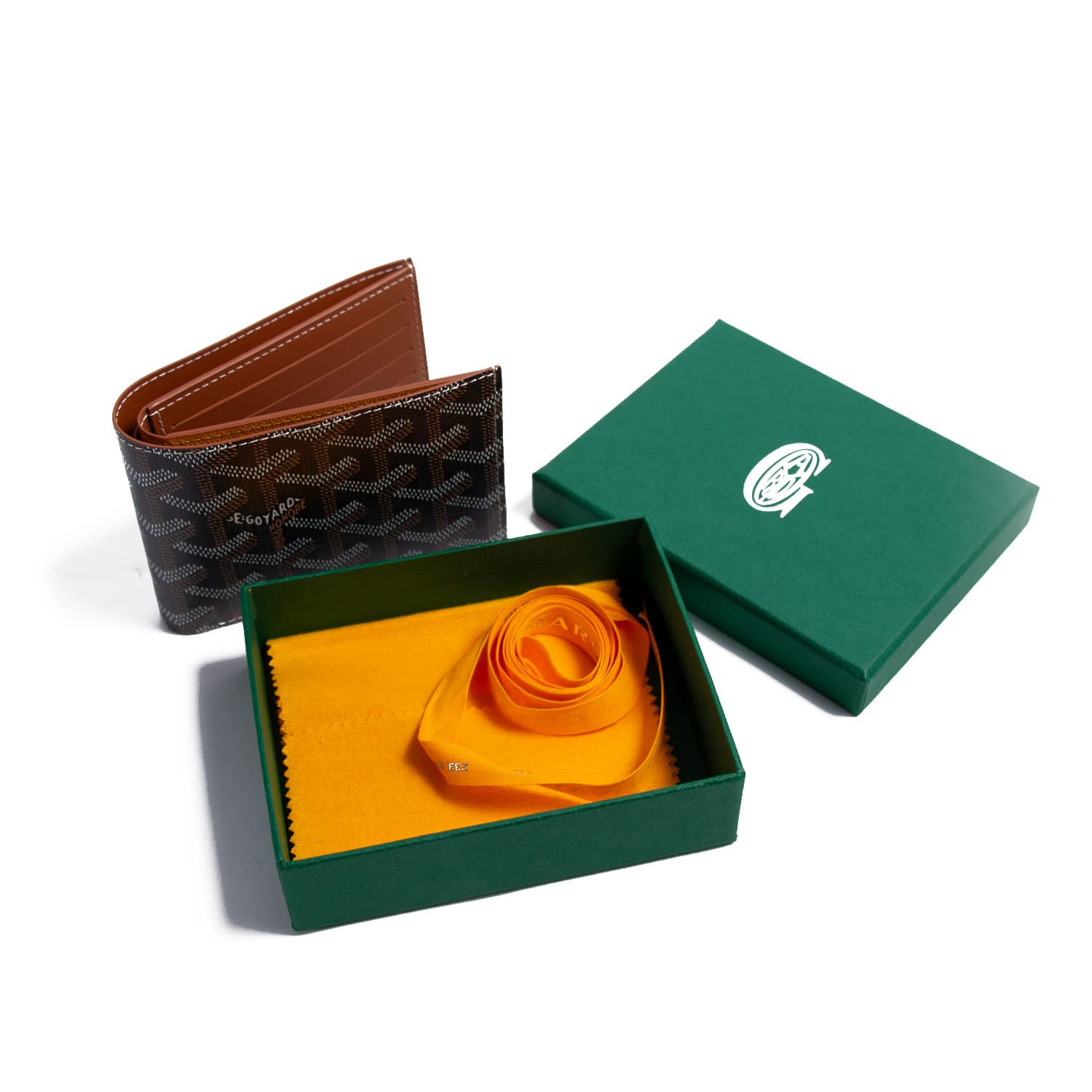 Details: Tan and Black Stenciled Goyardine Coated Canvas / Tan Leather Trim / Yellow Grained Interior Leather / Eight-Card Slots / Dual Bill Compartments / Dual Pockets